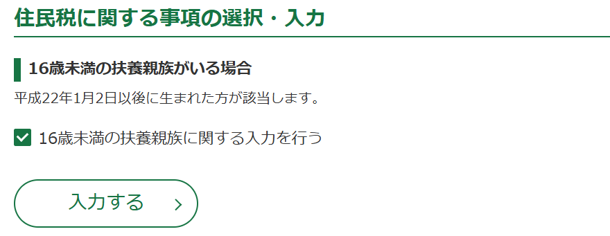 我が家は「16歳未満の扶養親族がいる場合」に該当するので、子ども2人の情報を入力しました。