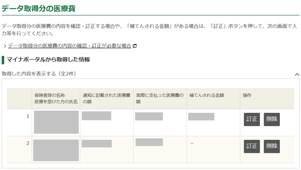 →【マイナポータルから取得した情報】で訂正