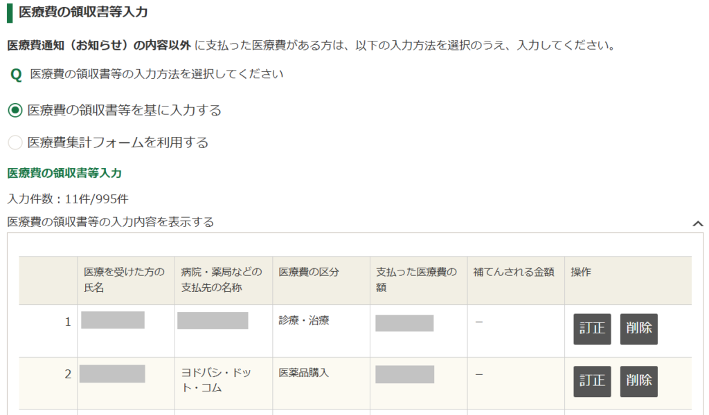 「領収書等1枚ごとではなく、医療を受けた方・病院等ごとにまとめて入力」と書いてあったので、娘の歯科矯正通院費1回5,500円×10カ月分まとめて1件55,000円で入力しました。