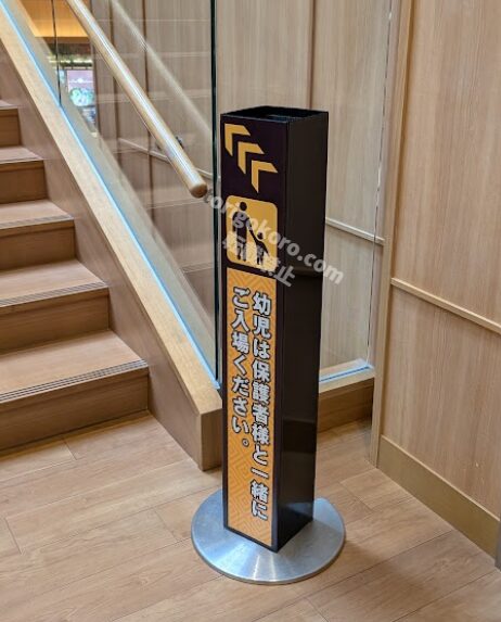 ↓5階岩盤浴エリアへのゲート前に「幼児は保護者様と一緒にご入場ください。」とあります。